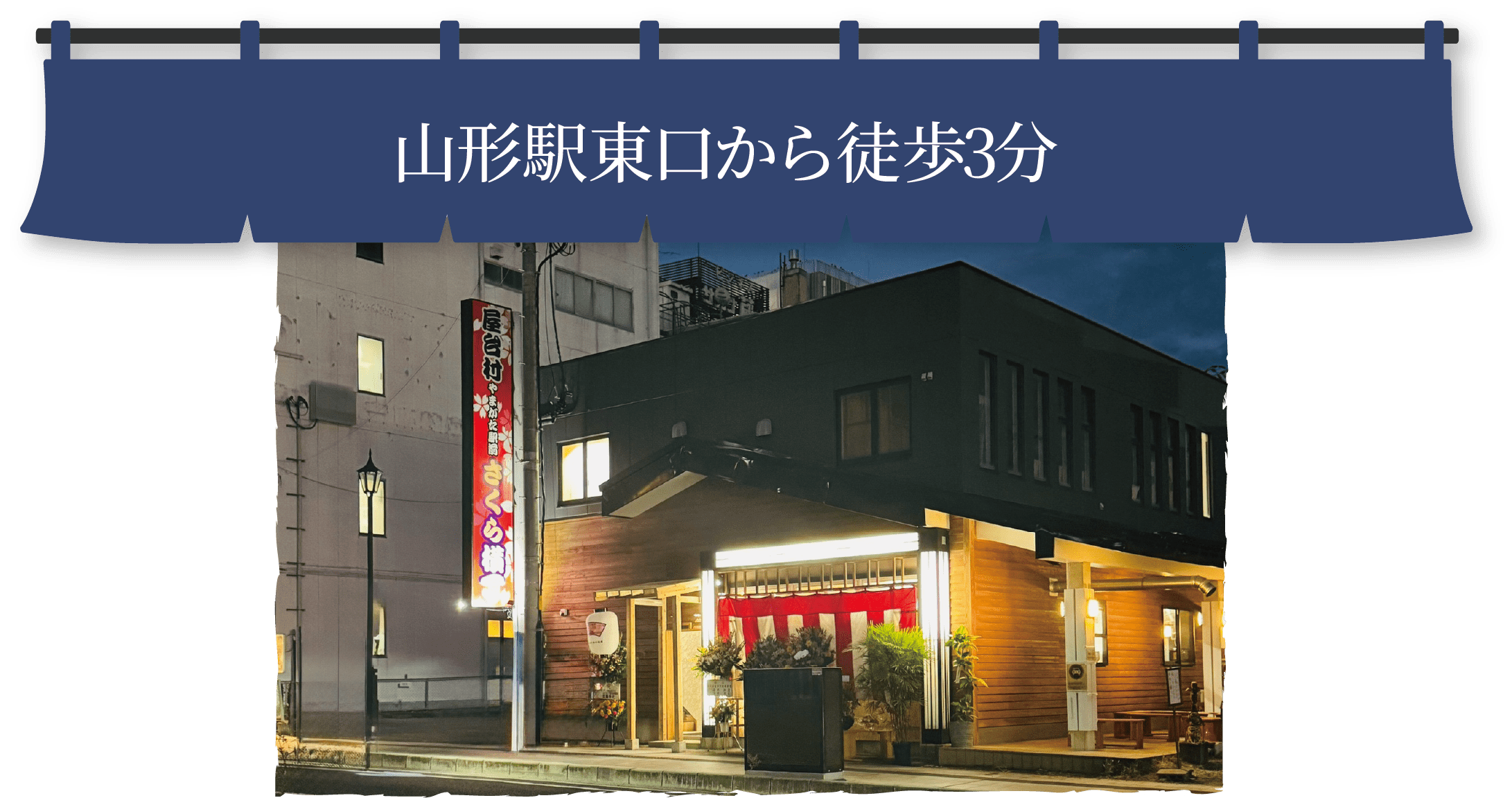 JR山形駅東口から徒歩わずか3分。屋内型屋台村「やまがた駅前さくら横丁」は、地元の食から個性豊かな専門店まで、多種多様な味が集う新しい食のスポットです。雨や雪の日も快適に楽しめる空間に、仕事終わりの一杯、仲間との宴会、観光客の皆様との交流が生まれます。さあ、今宵も横丁をハシゴして、山形の賑わいと人情を味わいませんか。